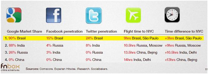 Para el 2018 se proyecta superar los 100 millones de consumidores online en Brasil con 160 millones de usuarios de banda ancha. Si sumamos a esta proyección la situación estratégica de este país respecto a otros países emergentes BRIC (Brasil, Rusia, India y China), su cultura occidental y la mayor penetración de modelos de negocios 2.0 globales, y los factores que comentamos en párrafos anteriores, podemos afirmar que Brasil representa claramente la ‘turbina’ de la Economía Digital Latinoamericana.