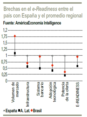 Un desafío pendiente para Brasil es el gobierno electrónico: el complejo sistema tributario brasileño ha sido un obstáculo para desarrollar el pago en línea de los contribuyentes. No obstante, Brasil es el país de la región que está más cerca de alcanzar a España en condiciones para el e-Commerce.