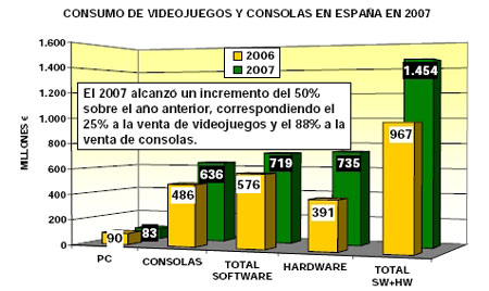 Según el mismo informe, el mercado de los videojuegos movió en nuestro país 1.454 millones de euros en 2007 . El número de consolas vendidas en nuestro país alcanzó 3.390.000 máquinas . En el contexto europeo, España mantiene el cuarto lugar en lo que se refiere a consumo de software interactivo y venta de consolas, por detrás de países como Reino Unido, Alemania y Francia. El mercado europeo en el año 2007 supuso más de 13.000 millones de euros en consumo de videojuegos y consolas, lo que se traduce en un 45% de incremento sobre 2006 ( un 50% en el caso de España).